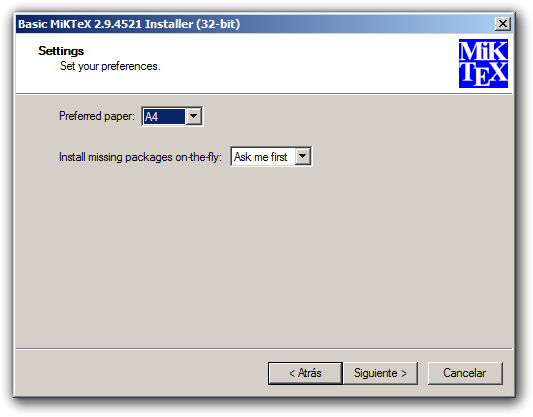 Este cuadro es importante. En primer lugar te pregunta por el tamaño por defecto del papel. Típicamente será A4. Esto te ahorrará tener que indicarlo cada vez en el fichero fuente .tex.